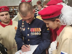 Поэт-десантник поделился с ребятами историей своего творчества, рассказал о солдатских буднях, фронтовых испытаниях и вдохновении, которое привело его к поэзии. Особое впечатление произвёл рассказ о первой любви, с которой начался его путь к стихам, а также воспоминания о встрече с Верховным Главнокомандующим — Президентом Российской Федерации В. В. Путиным.